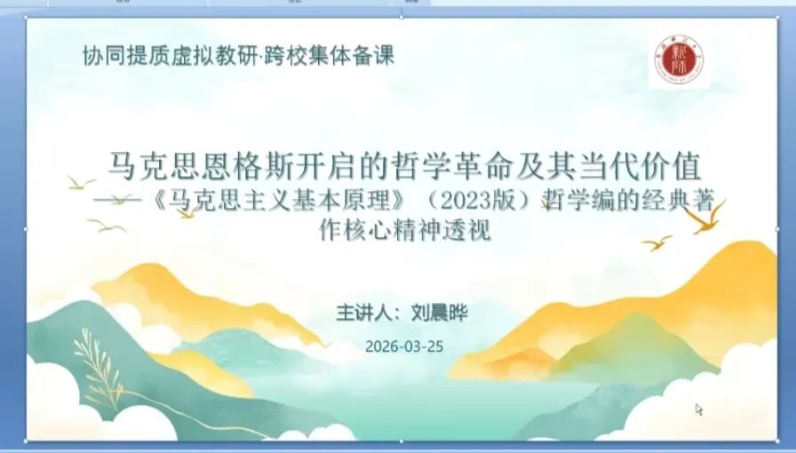 3月25日,马克思主义学院原理课程组依托云端平台,参加了由新疆师范大学马克思主义学院主办的协同提质虚拟教研跨校集体备课活动。此次活动旨在打破地域壁垒,实现优质教学资源的跨校共建共享,是深化大中小学思政课一体化建设、发挥重点马克思主义学院辐射带动作用、加强对高职院校对口帮扶与协同共建的重要举措。