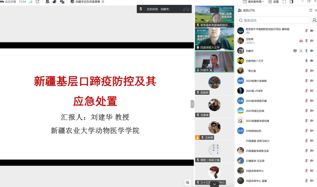 近日,巴音郭楞职技术学院作为2025年自治区科技特派员项目——“若羌县牛羊临床常见疫病诊断及综合防控推广应用科技特派员试验示范站”项目组成员,牵头举办了《新疆基层口蹄疫防控及其应急处置》专题线上讲座。本次讲座特邀新疆农业大学动物医学院刘建华教授担任主讲。巴音郭楞蒙古自治州各县市农业农村部门负责人、基层防疫员及畜牧兽医专业师生等共计270余人次通过线上平台参会,共同学习交流防控知识与应急处置经验。