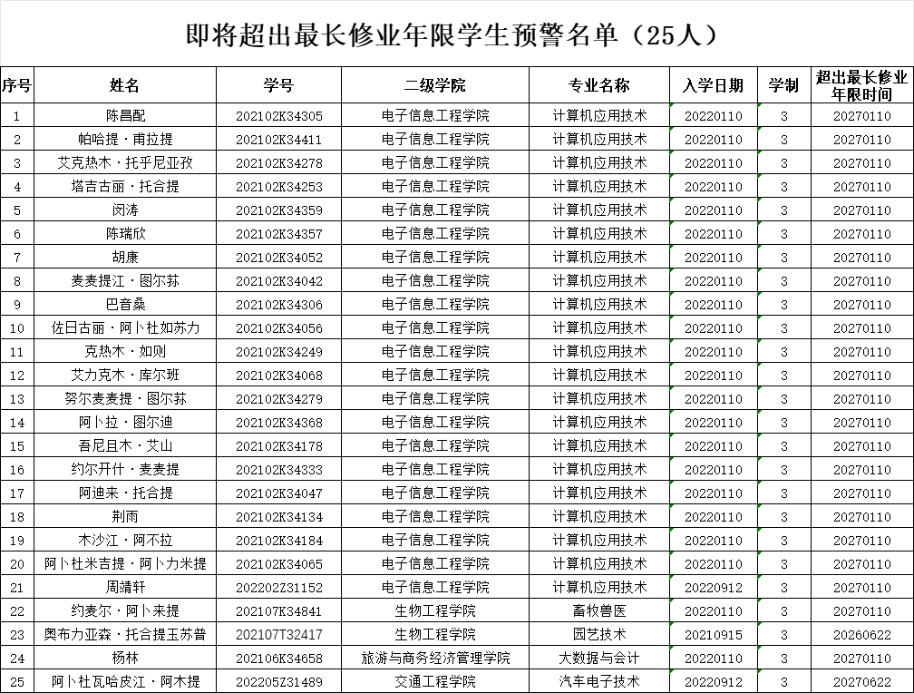 根据《普通高等学校学生管理规定》(教育部令第41号)第三章第五节第三十条“学业成绩未达到学校要求或者在学校规定的学习年限内未完成学业的,学校可予退学处理”,《巴音郭楞职业技术学院学籍管理规定》第六章第二十三条“学业成绩未达到学院要求或者在学院规定年限内(含休学)未完成学业的,应予以退学”,现对我院25名因未提供学历照片、学业成绩未达标,将超出最长修业年限(5年)不满足毕业条件的学生做预警公告。